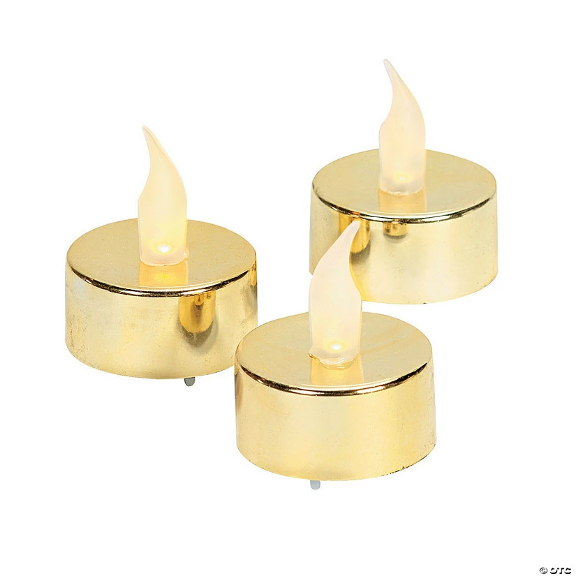 Illuminate the night with these Battery-Operated Tea Light Candles. These battery-operated plastic tea lights light up your celebration without a waxy mess. You can safely decorate for any party or event with this βbright ideaβ! Each long-lasting little light has an on/off switch and fits in a votive or tea light candleholder. 1 1/2″ diameter. Batteries included.