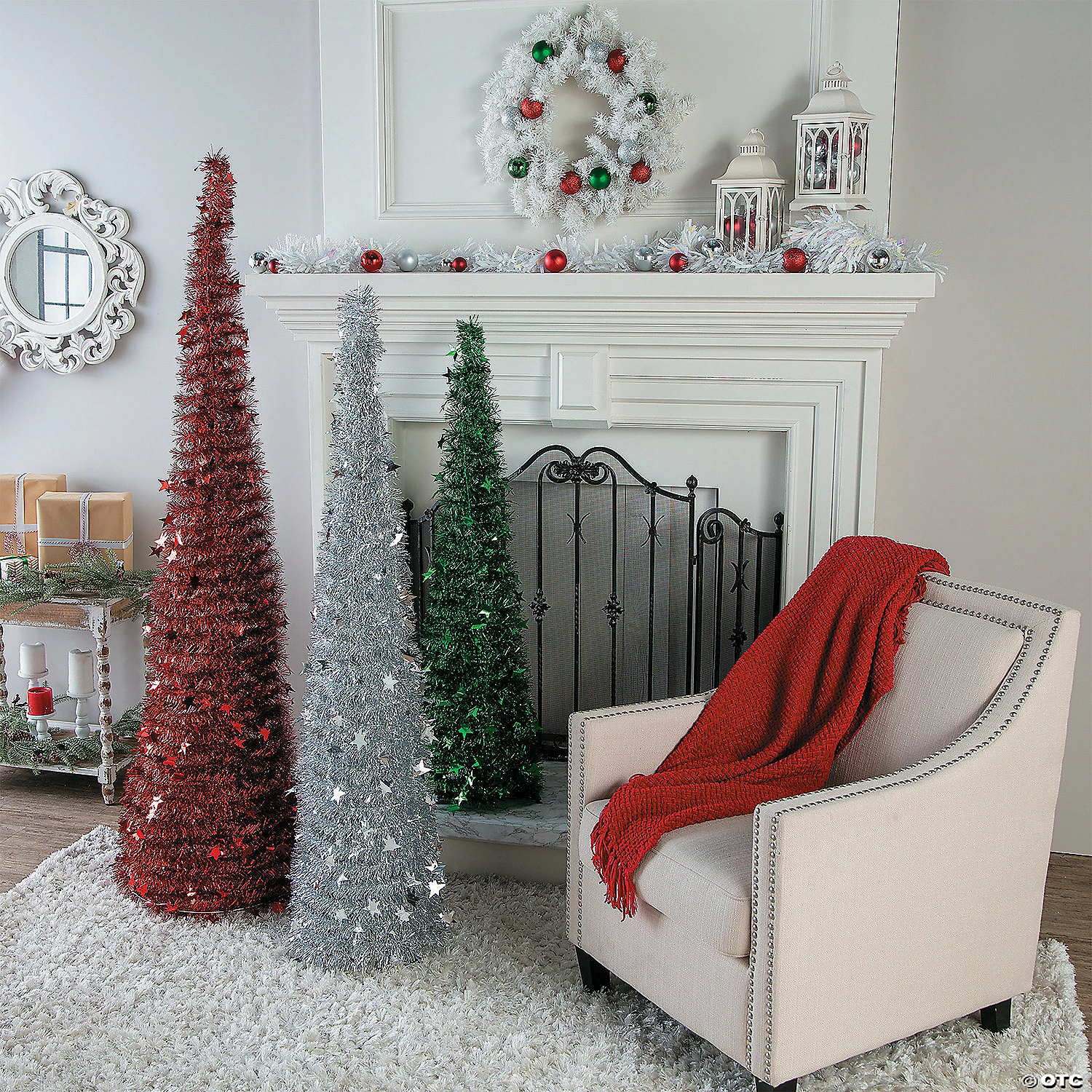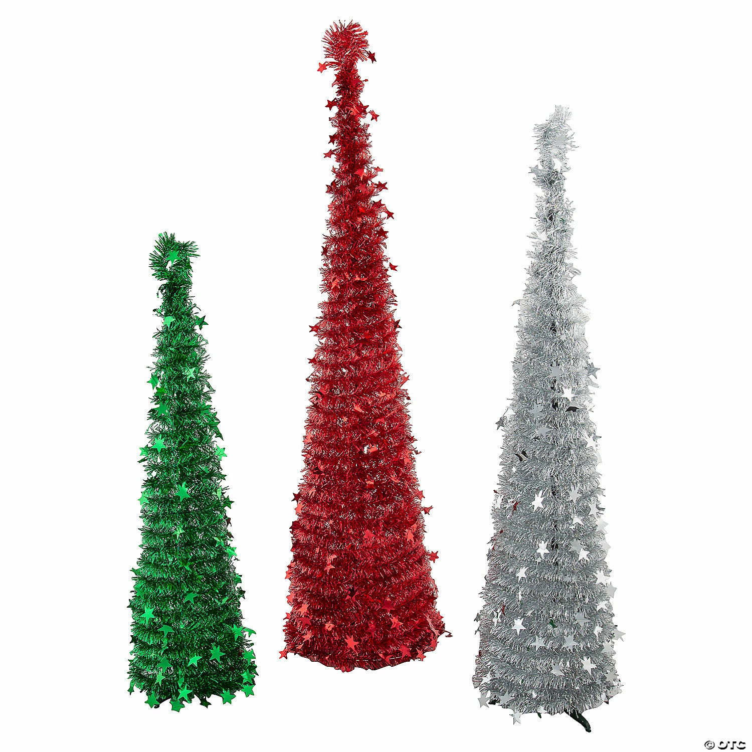 Featuring three classic-style tinsel trees in three sizes, this Collapsible Red, White & Green Tinsel Tree Set will make spirits bright for years to come. Place these near your natural fir or just around your space to add Christmas-y whimsy. This set is easy to store and set up, so you can use it season after season, at home, church or in the classroom. Plastic. 4 ft., 5 ft. and 6 ft.