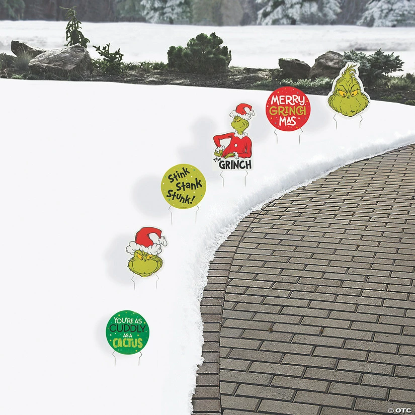 The Grinch is in town and heβs here to steal Christmas! These sidewalk signs feature the fan-favorite Dr. Suessβ’ character and themed phrases. Display this Grinch-tastic collection alongside any sidewalk as a fun way to greet people strolling by your house. Find more exclusive Grinch holiday decorations on this website. Plastic. (6 pcs. per unit) 8″ x 8″ – 12-1/2″ Includes metal stakes. Single-sided. Simple assembly required. Only at OTC / β’ & Β© Dr. Seuss Enterprises, L.P. All Rights Reserved.Grinch Sidewalk Signs Instructions