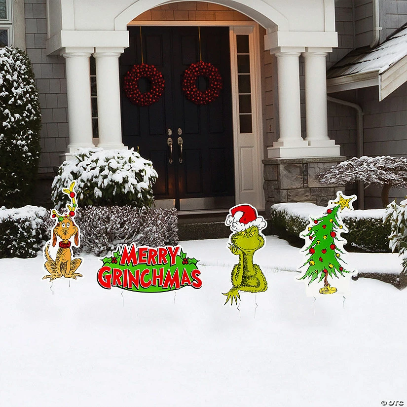 Wish neighbors and visitors a very Merry Grinchmas with these brightly colored yard decorations! Featuring the Grinch, his dog Max and other holiday designs, this set of yard signs will look great alone or placed alongside your other outdoor Christmas decorations. Single-sided. Includes metal stakes. Corrugated plastic. (4 pcs. per unit) 10″ – 20″ x 12″ – 24″ on 22″ stakes. Simple assembly required. ยฉ OTC / TM & ยฉ 2021 Dr. Seuss Enterprises, L.P. All Rights Reserved.
