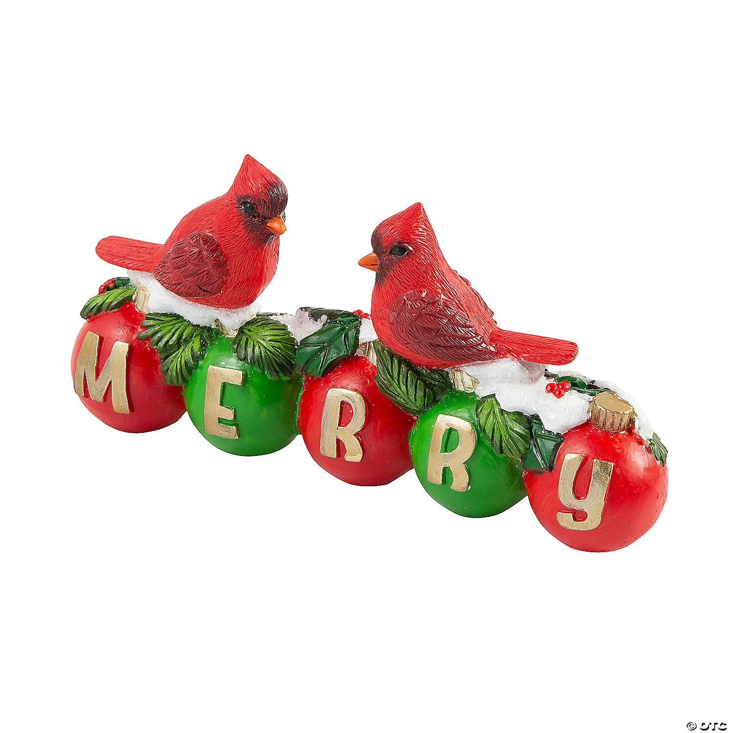 Dress up a table with Christmas cheer! This festive tabletop decoration features red cardinals sitting on faux greenery, all on top of a pretty row of red and green ornaments adorned with the word, βMerry.β Your holiday party will be extra merry and bright with this decoration displayed. Resin. 7 3/4″ x 1 3/4″ x 3 1/2″ Β© OTC