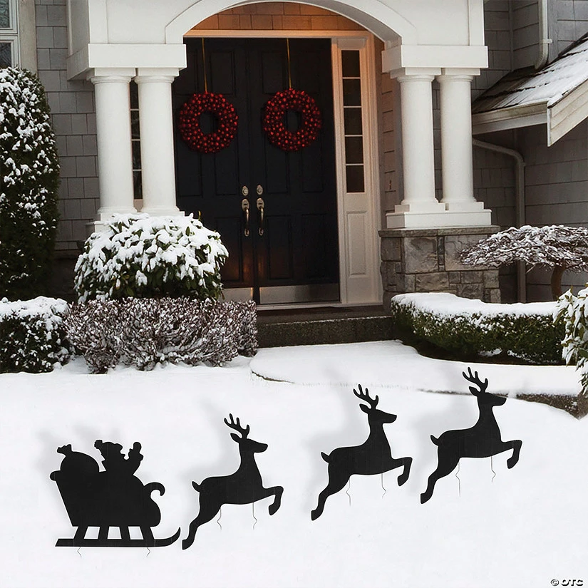 Get ready to celebrate all things holly and jolly with this festive yard sign set featuring a silhouette of Santa in his sleigh and his reindeer helpers up front. Add this eye-catching set to your outdoor Christmas decorations for a ho-ho-holiday look that will impress neighbors. This set looks great alongside other outdoor decorations but can also be displayed on its own and still have a decorative impact. Corrugated plastic. (4 pcs. per unit) Santa, 19 1/2″ x 16″; reindeer, 14″ x 19″. Includes metal stakes. Double-sided. Simple assembly required. ยฉย OTCSanta & Reindeer Silhouette Yard Sign Instructions