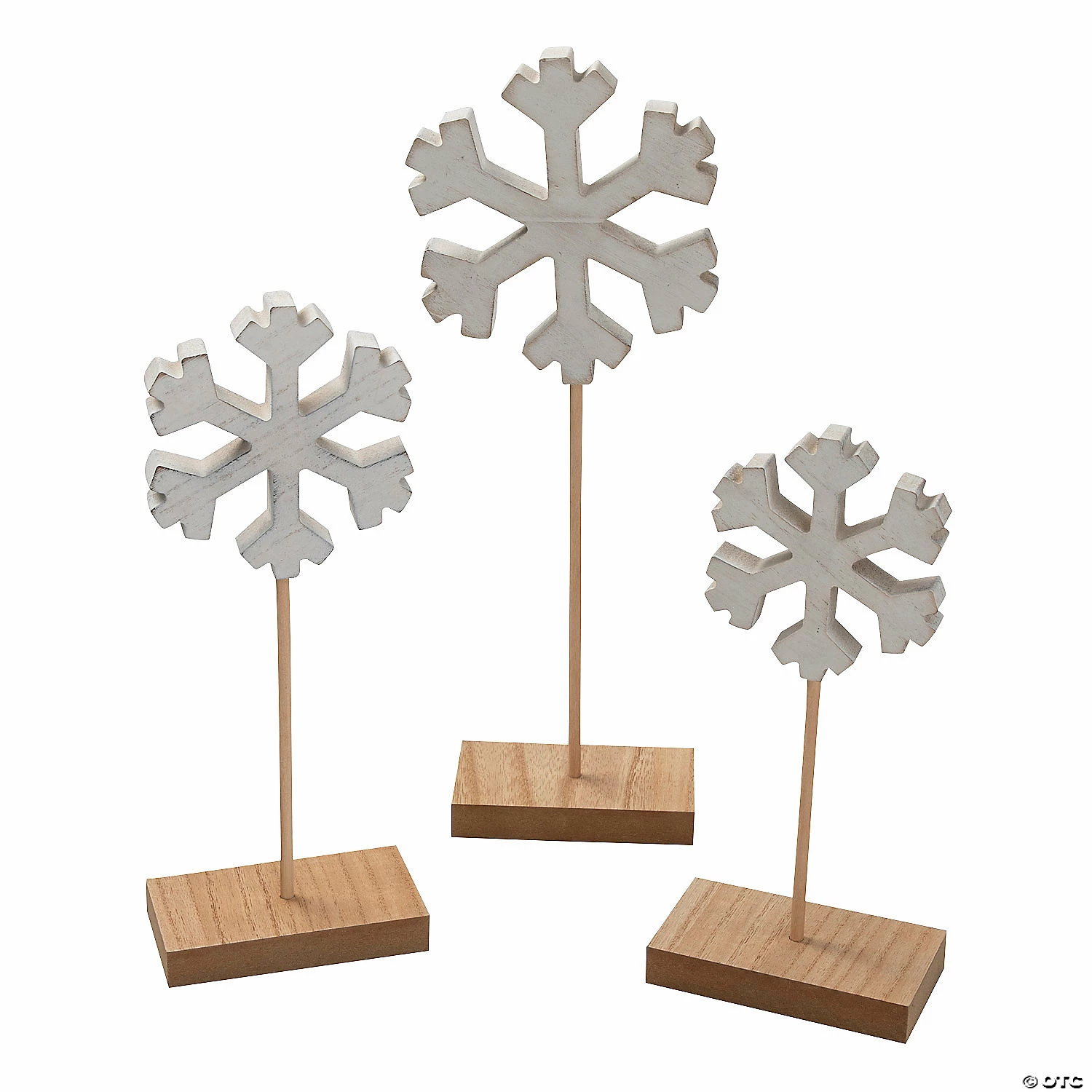 Unique yet timeless, these Snowflake Pedestal Tabletop Decorations add height and elegance to your seasonal decor configuration. Bring out the wintry magic in your space, these tabletop pedestals are great as Christmas party embellishments or for seasonal events. These pieces also make lovely gifts or prizes at a holiday party. Wood. (3 pcs. per set) Large, 5 1/4″ x 14 1/2″; medium, 4 1/4″ x 11 1/4″; small, 3 1/4″ x 9 3/4″.